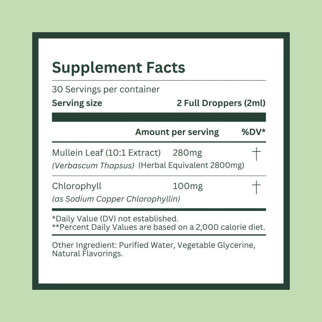 Our mullein drops combine two potent, plant-based ingredients — Mullein Leaf and Pure Chlorophyll — both known for their natural support of respiratory health and overall wellness.